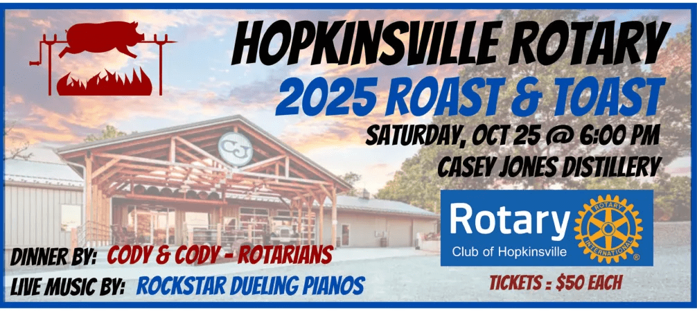 click to download audioOnce again, the Hopkinsville Rotary Club’s Roast and Toast fundraiser is set for Saturday, October 25th from 6 to 9 p.m. at Casey Jones Distillery.
