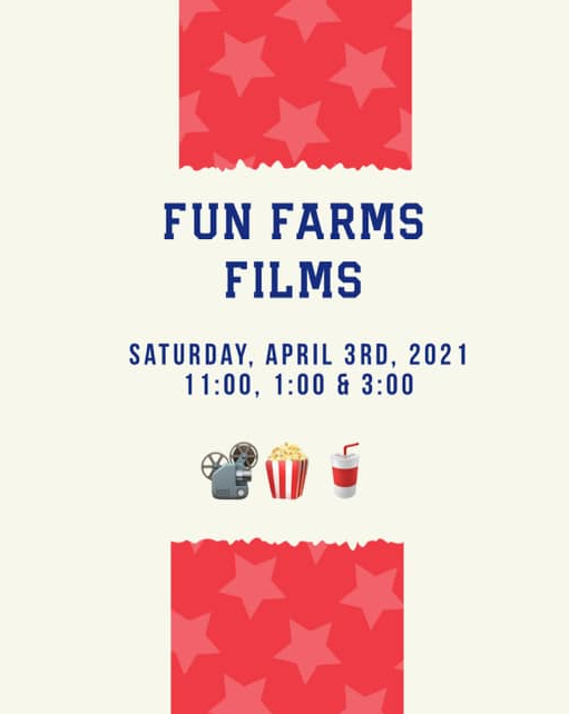 Feature Films at 11 am, 1 pm, and 3 pm at the Hardy Fun Farms!