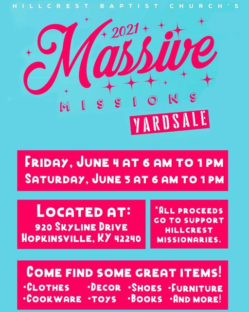 We can’t wait for this MASSIVE Yard Sale here in Hopkinsville, Kentucky! The best part? All the proceeds go to support our Hillcrest missionaries, as they travel all over the world sharing the good news of Jesus. Save the date!