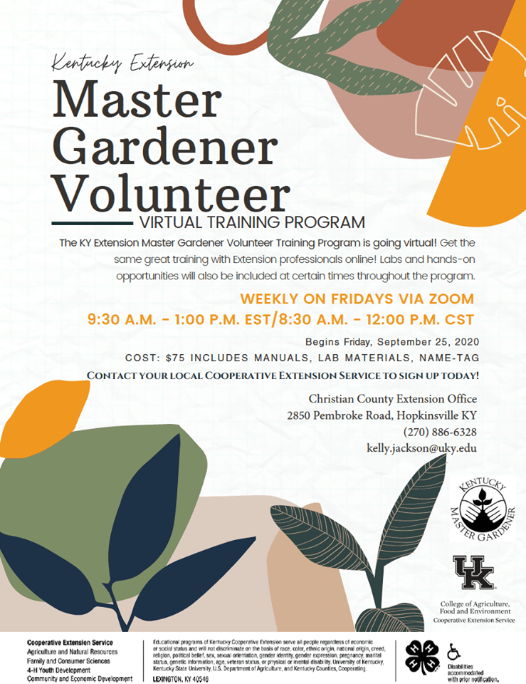 The Master Gardener Training course is moving online! Classes begin September 25. See below for more information and call the Christian County Extension office at 270-886-6328 to get registered.
