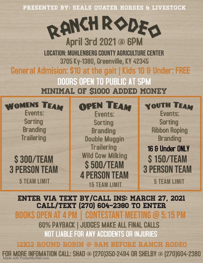 Ranch rodeo with events for the whole family. Open, all-women, and youth classes. Check the flyer for more information or message with any questions. Spectators welcome!