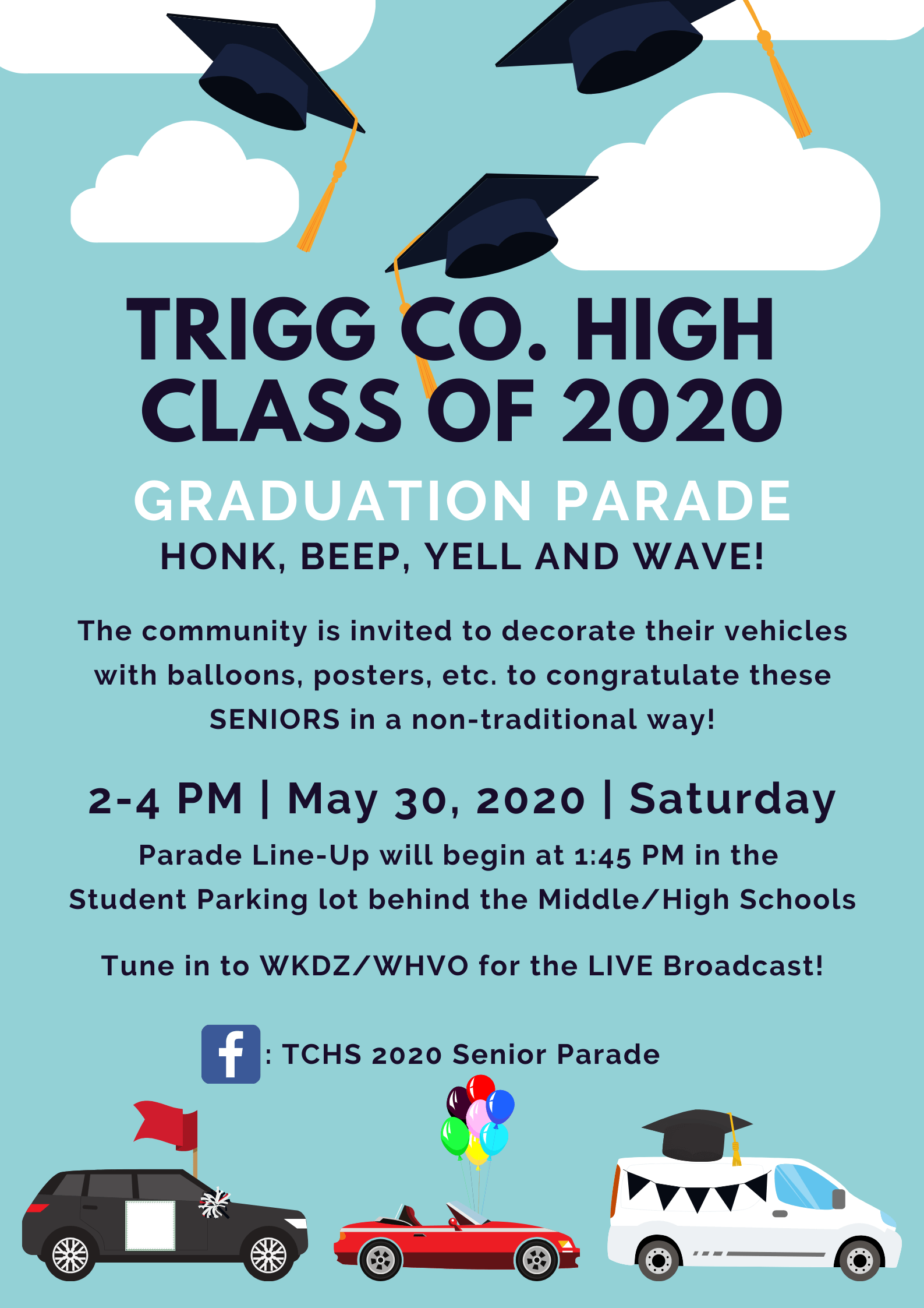 There will be a parade to honor the Class of 2020 at Trigg County High School, Saturday, May 30, beginning at 2:00pm. Lineup for the parade will get underway at 1:45pm in the Trigg County High School/Middle School parking lot.