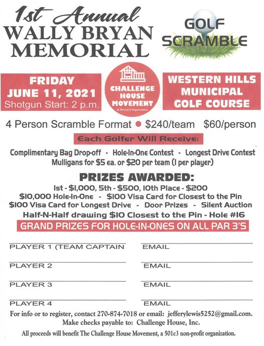 Challenge House will be hosting the 1st Wally Bryan Memorial Golf Scramble on Friday, June 11, 2021. Get your 4 person team together and register today.