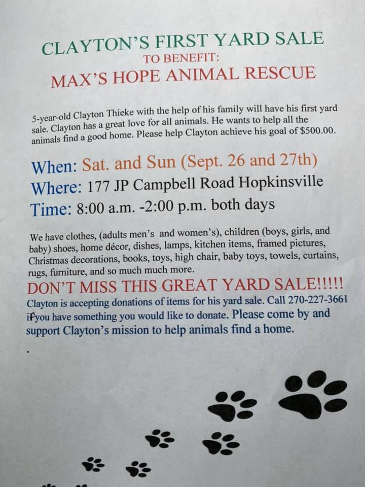 Clayton Thieke, with the help of his family, is having a yard sale to benefit Max’s Hope on September 26th and 27th. Donations accepted!